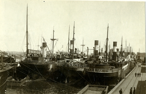 Svenska Lloydångare vid Nya Kajen i Göteborg. Foto efter den 31 januari 1917, då det s.k. oinskränkta U-båtskriget förklartas av centralmakterna.