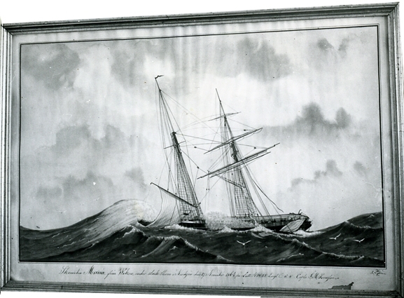 Fartygstavla hos fru Ruth Pålsson. Skonerten Maria under stark storm i Nordsjön den 27 november 1864 på latitud N 28.23 Longitude O 6,4, Capt. C. Svensson. Akvarell signerad I.M Svensson. Skåne, Malmöhus län, Viken.