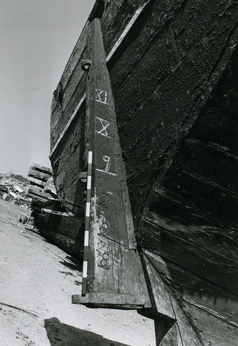 Vrak funna vid muddring av frihamnen i Stockoholm för magasin 5, år 1965-66. Ämnesmärkning av akterstäven.