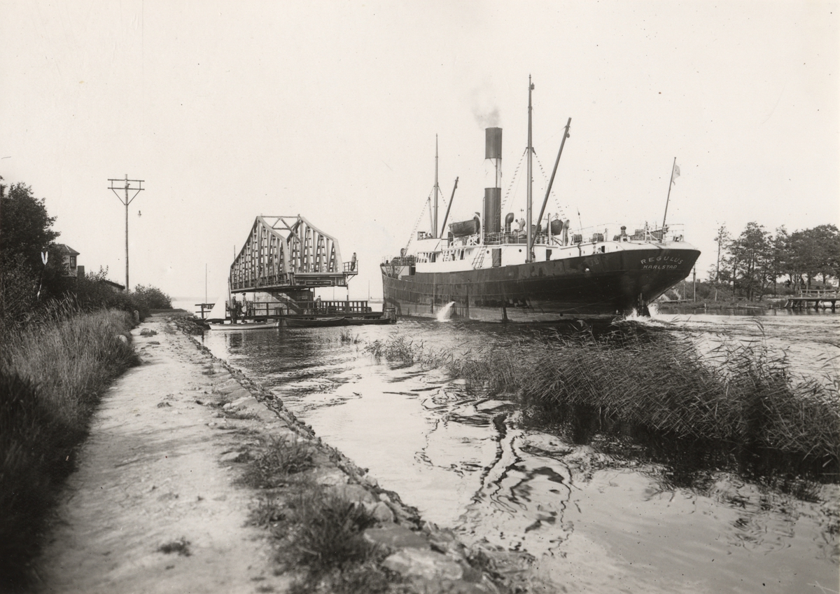 Vänersborg, Nya Dalbobron. Lastångfartyget REGULUS av Karlstad passerar.