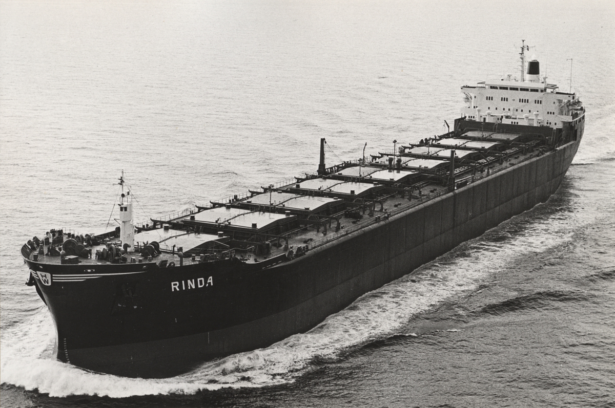 Foto i svartvitt visande bulkmotorfartyget RINDA.