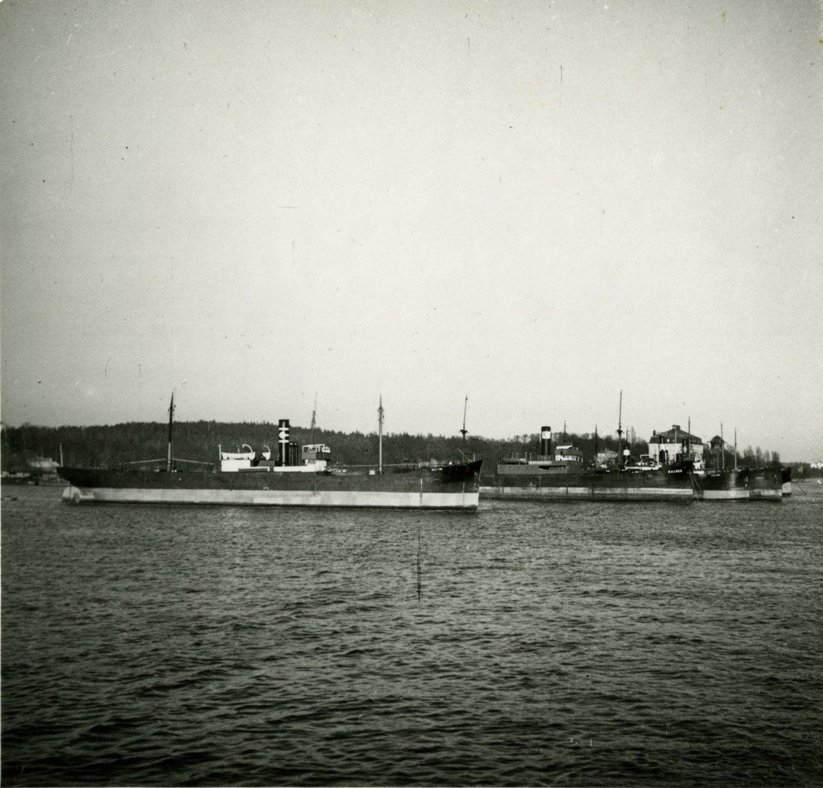 Lastångfartyget WILTON av Stockholm. Upplagt tonnage vid Rosenvik på Djurgården sett från Finnboda Varv, 1938.