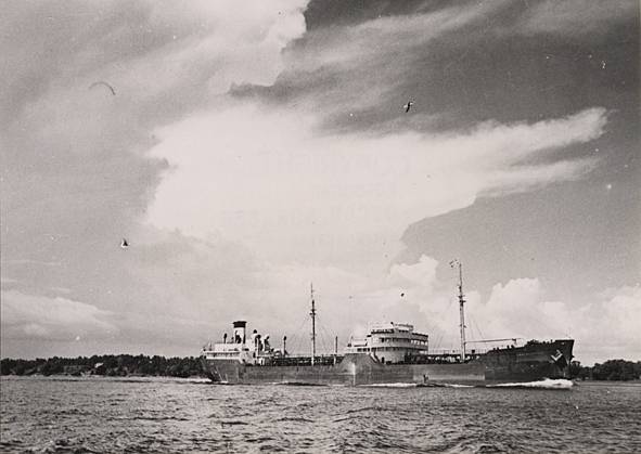 Turboelektriska tankfartyget ESSO WORCESTER av Wilmington, USA, på väg ut mot Kanholmsfjärden, 1953.