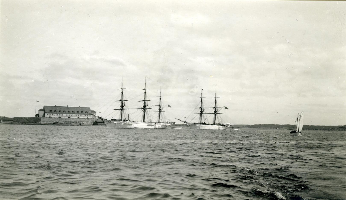 Två segelfartyg, en brigg och ett fullriggat, till ankars i Karlskrona hamn.