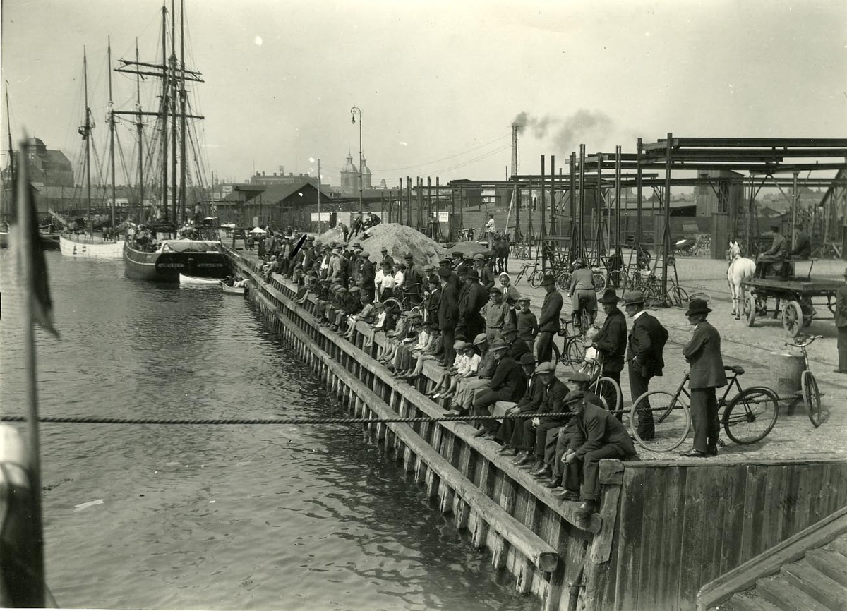 Människor på kajen i Landskrona hamn. Betraktar troligen u-båten "Braxen".