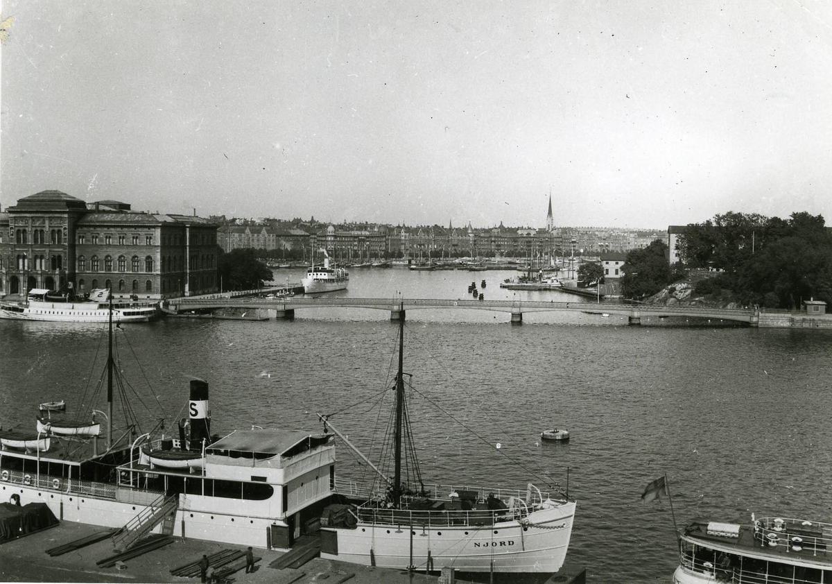 I förgrunden last och passagerarfartyget Njord vid Skeppsbron. I bakgrunden Nationalmuseum, Skeppsholmen och Strandvägen.
