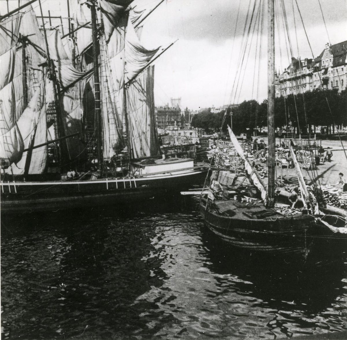 Skonare och jakter vid kajen i Nybroviken, ca 1920.