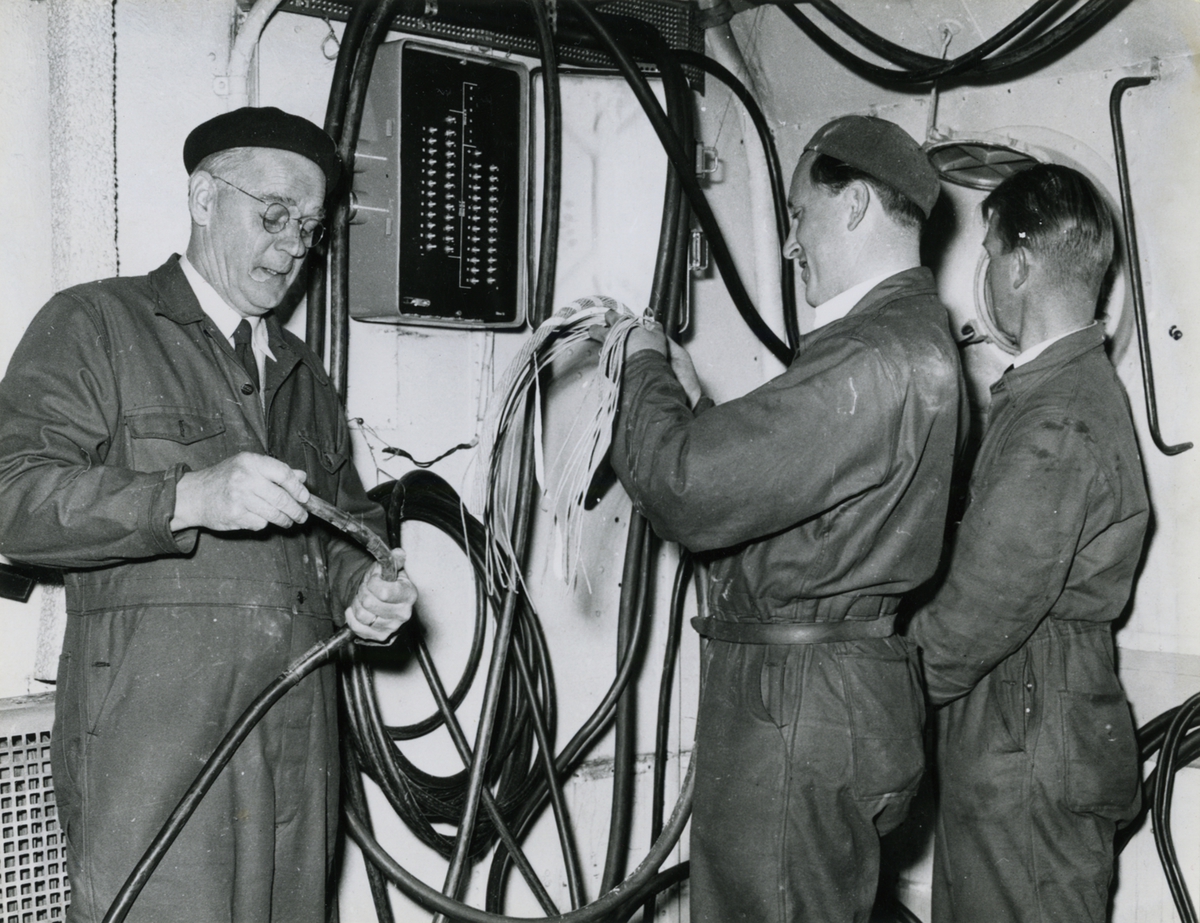 Karlskrona örlogsvarv. Montage av elektrisk anläggning 16.8 1956