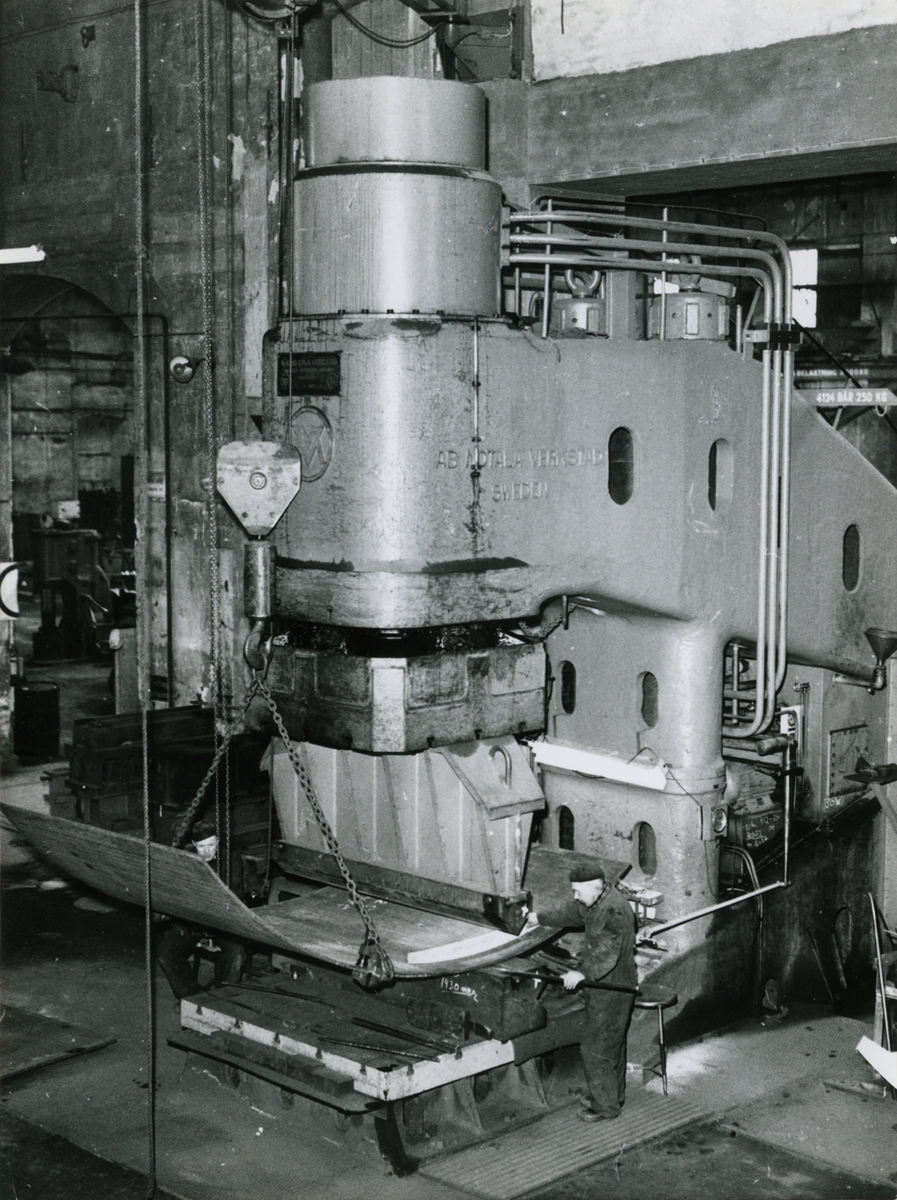 Karlskrona Örlogsvarv, plåtverkstaden. Bockning av plåt i 750 tons hydraulisk skeppsbyggeripress 27.4 1957.