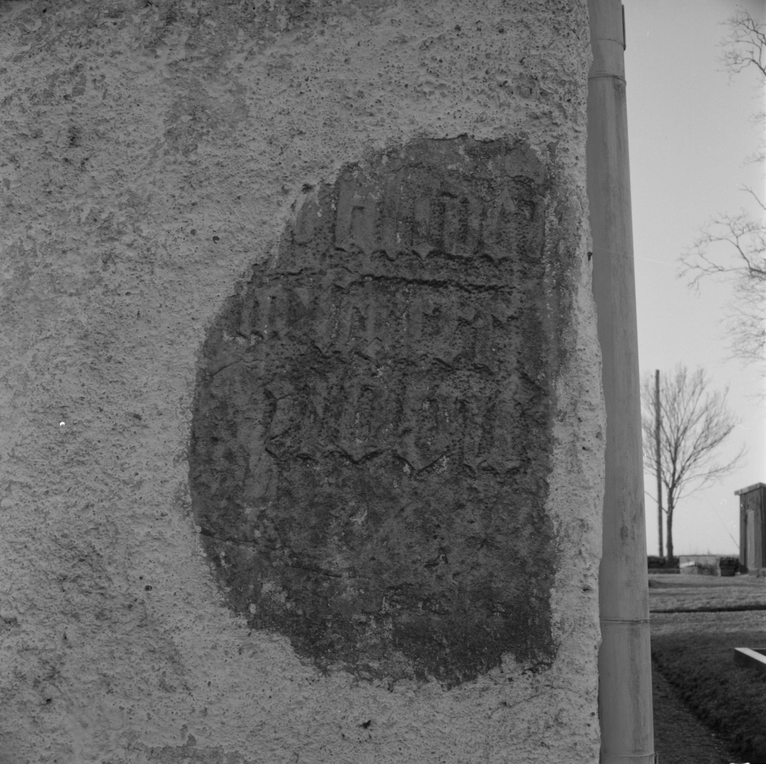 Sandsten med inhuggen inskription i kyrkans södra hörn.