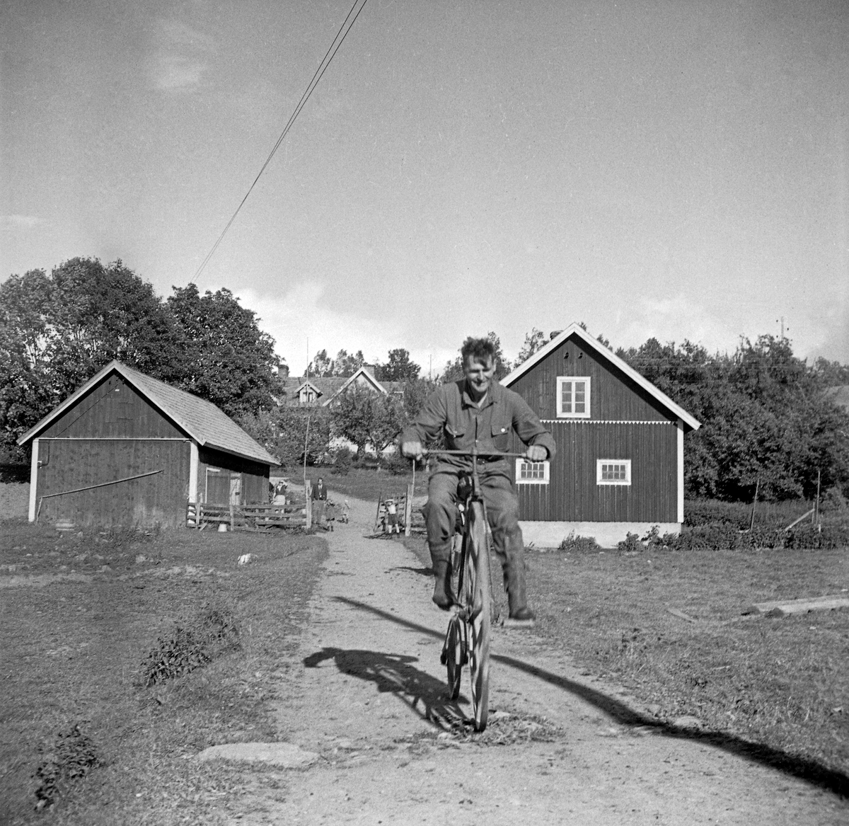 Från Holkaberg i Ödeshög 1949 där denna vanskliga färd med träcykel förevigades. Cykeln uppges vara tillverkad av fadern till gårdens dåvarande ägaren.