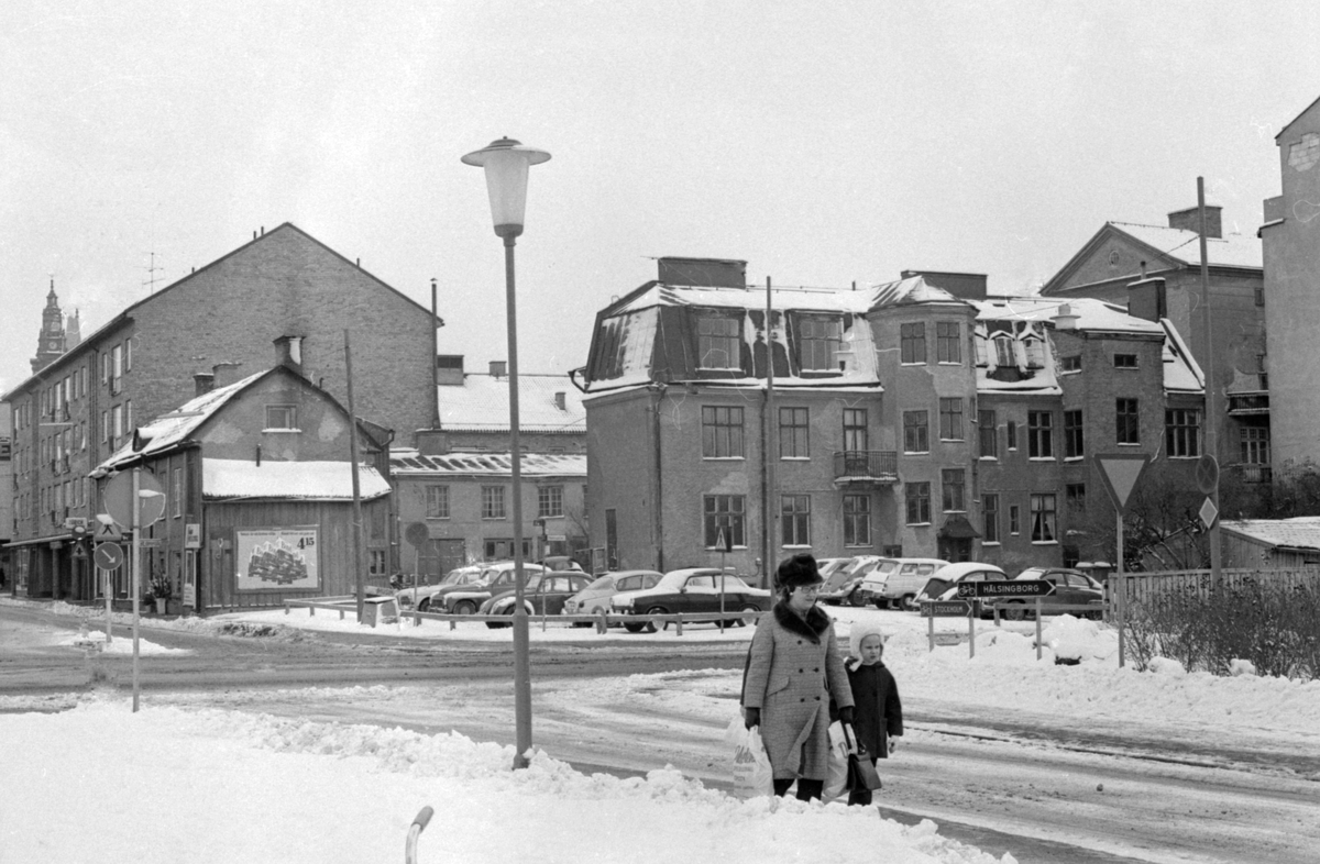 Om man i början av 1970-talet mötte centrala Linköping från Storgatans östra ände, slogs man av denna vy. Som synes ett ganska slitet intryck. Närmast Storgatan 3.