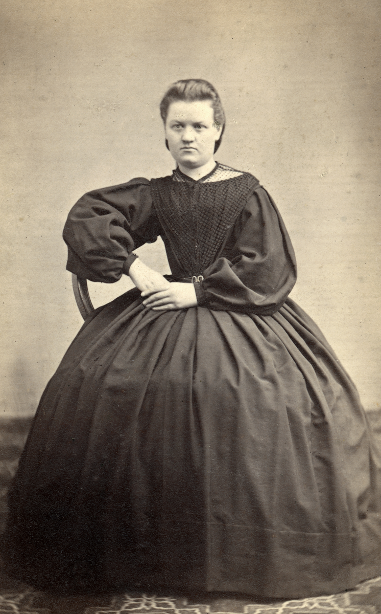 Ungdomsporträtt av Hilda Davidsson, Linköping. I hennes fall kunde det olyckligtvis inte annat bli. Redan vid 27 års ålder insomnade hon stilla och lungt i sviterna av maginflammation. I livet var hon dotter till klensmedsmästaren Nils Davidsson och makan Brita Christina. Foto omkring 1865.