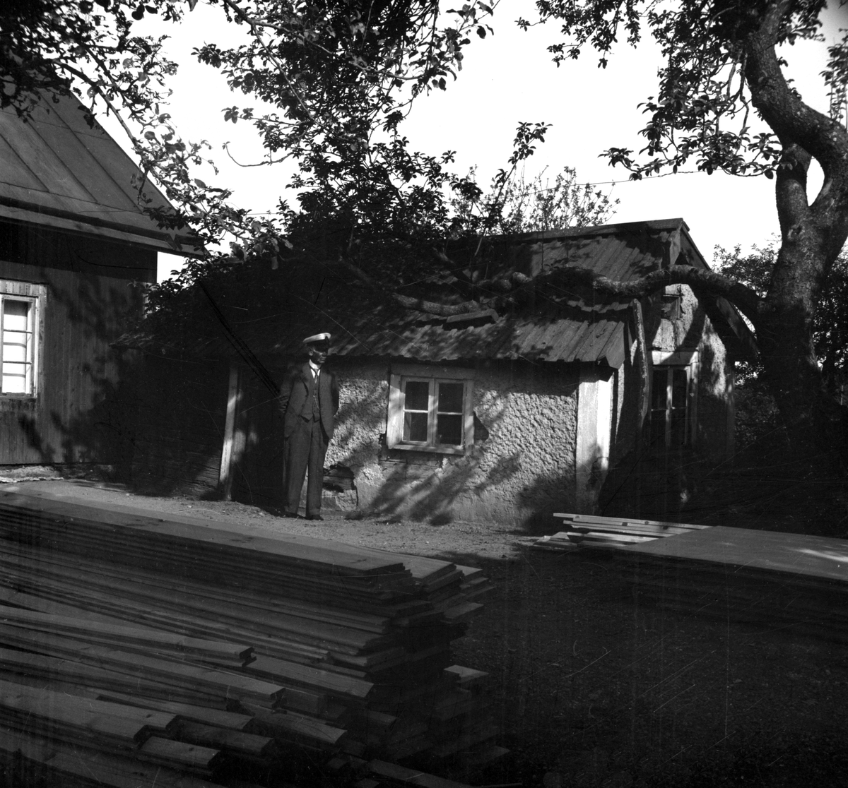 Från gårdsplanen till det forna torpet Limningsängen i Berg. Trädgårdens högvuxna fruktträd gav ställvis skugga som lurade kamerans optik, dock inte utan resultat av det lilla gårdshuset. Och det var nog huset som fått personal från Östergötlands museum att göra sig ärende till Berg, åtminstone till nedslaget i Limningsängen. Vi kan inte så gått veta, ty inget övrigt kring platsen blev skrivet. Andra källor ger emellertid besked, åtmonstone att spekulera kring. Fotoåret 1947 var torpet sedan länge friköpt från huvudgården Brunneby och ägaren Karl Vilhelm Bengtsson hade bedrivit snickerirörelse från platsen men var nu avliden. Virkesupplagen minner ännu om honom. Ny ägare var Gustav Regnér och kanske står han invid stugan. Regnér titulerade sig lagerchef och bodde centralt i Linköping. Limningsängen var rimligtvis tänkt som sommarbostad eller möjligtvis exploatering.