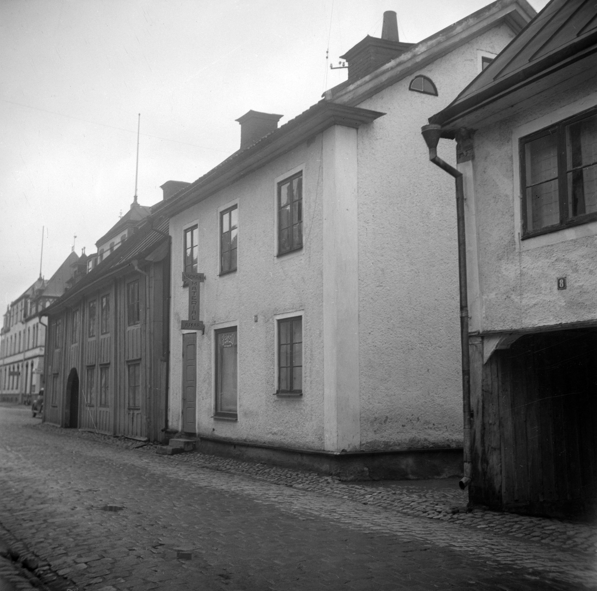 Skönbergagatan 10 i Söderköping. Från fasaden annonserar Hagman sin något dunkla affärsrörelse "Materialaffär". I staden visste man naturligtvis att det rörde sig om Gunnar Hagmans färghandel. Vid sidan av sin affärsrörelse drev han även målarverkstad lite längre ned utefter gatan.