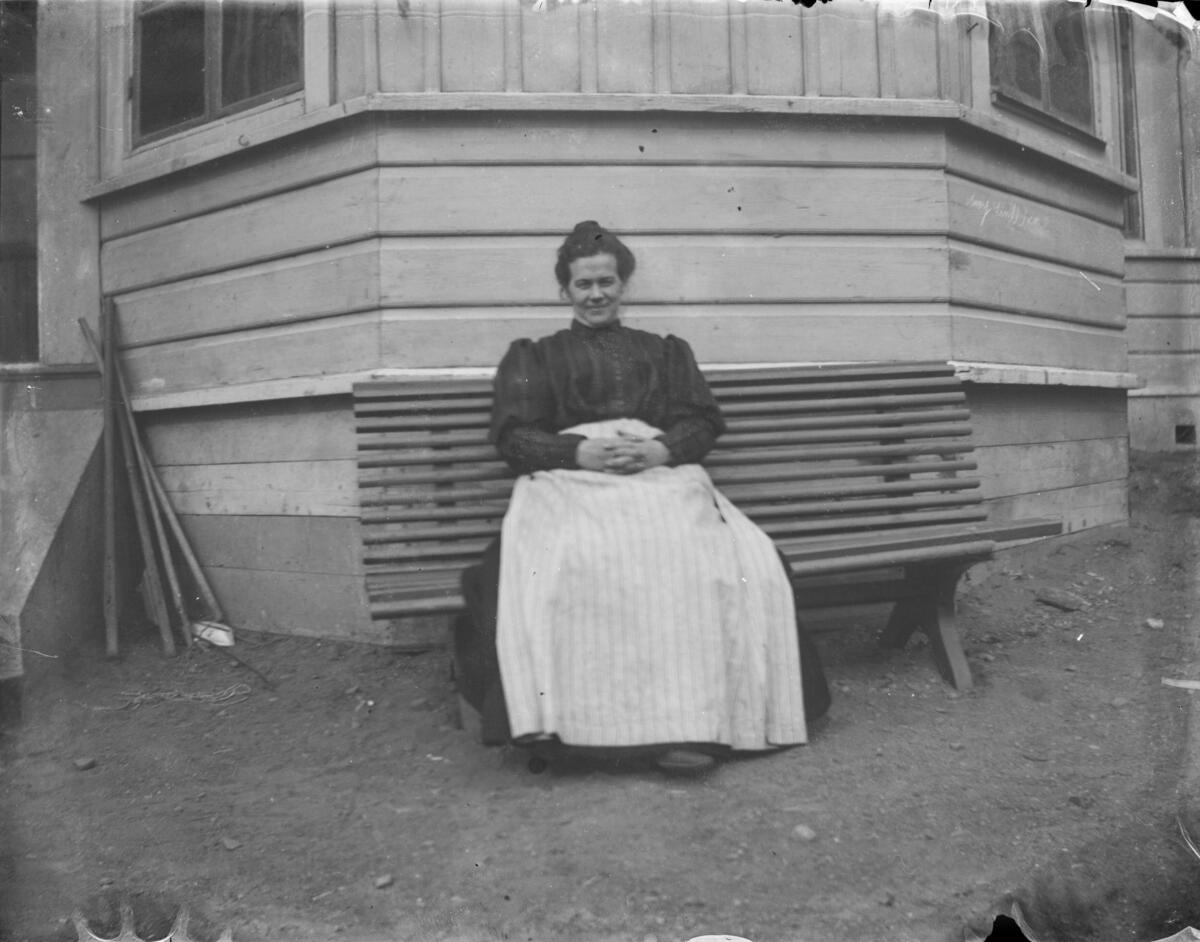 "Mamma. Av RL." Kvinna som sitter på en trädgårdssoffa framför bostadshus.
