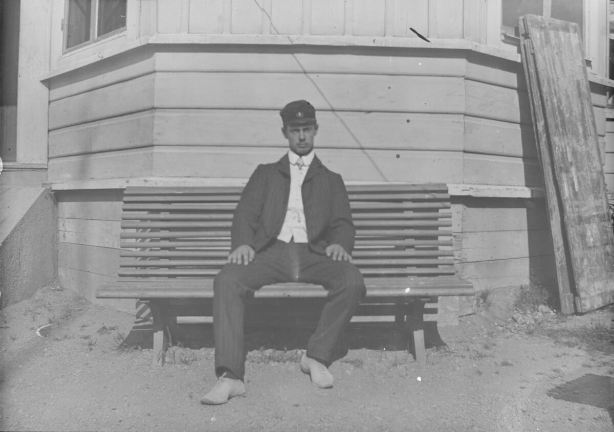 "J. L. på soffan utanför knuten. 16/8 1908. Av R. L." Man på trädgårdssoffa utanför bostadshus.