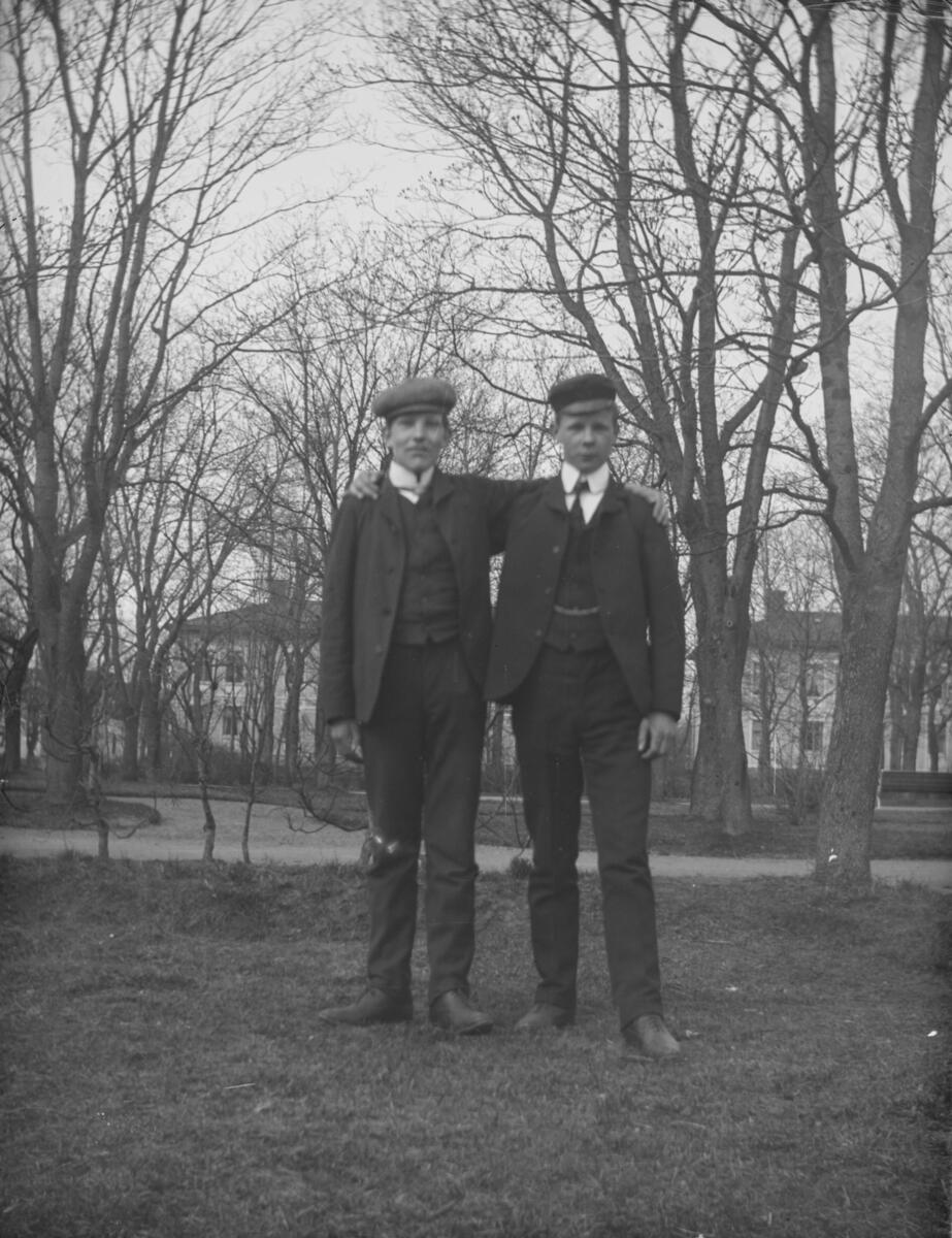 "Bäckström och Hägglöv. Av R. L." Porträtt utomhus av två unga män. 1910-talet.