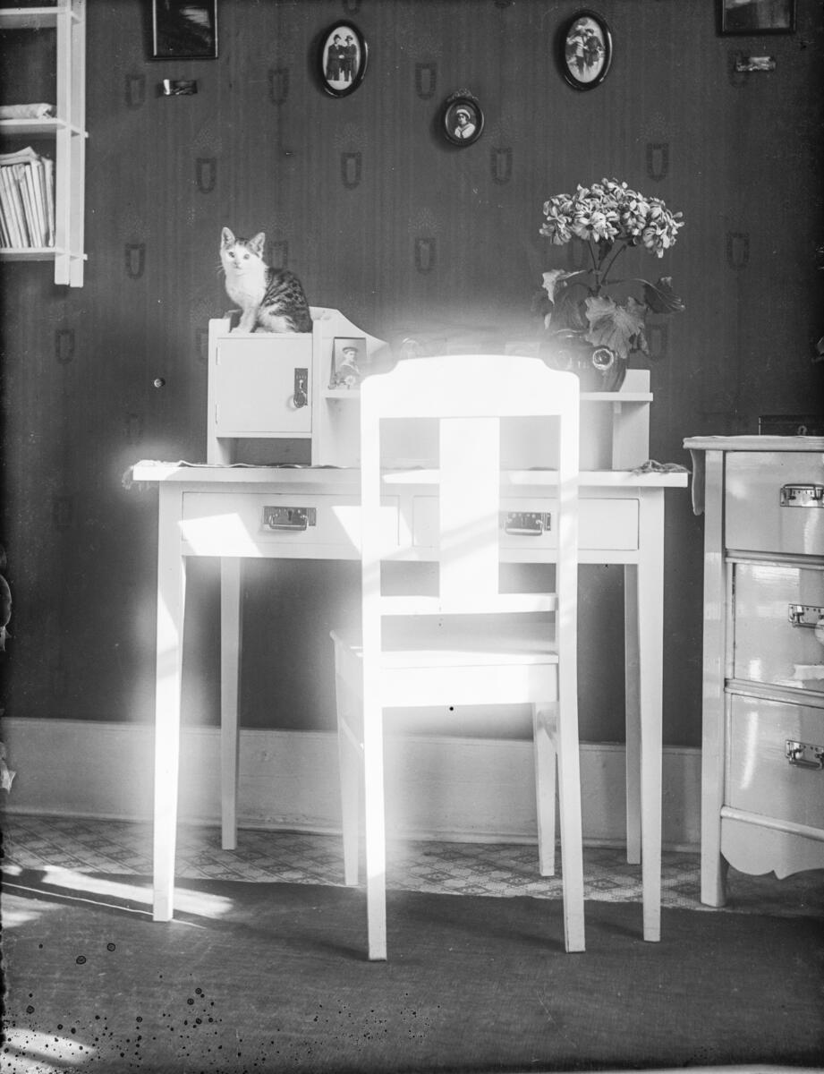 "Kissungar på Agnes skrivbord. 2s. f. 11. 14.00 25/4 1916. Sol.Agfa." Kattunge på skrivbord. Interiör.