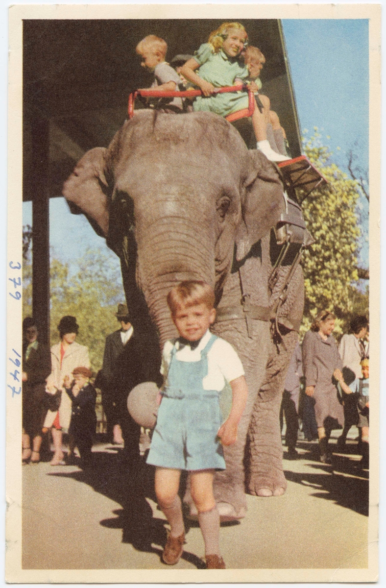 Titel: Vykort med motiv från Skansen. Barn som rider på elefanten Bambina.