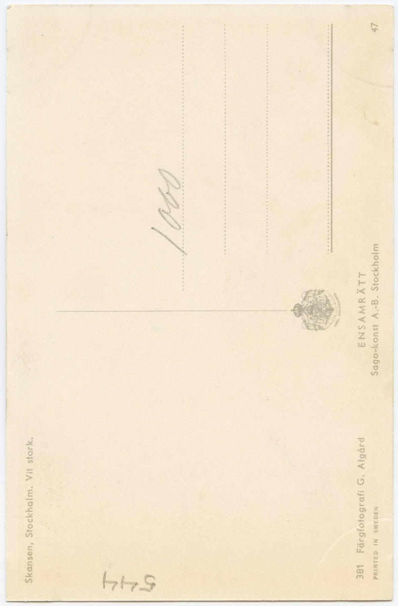 Titel: Vykort med motiv från Skansen. Vit stork.