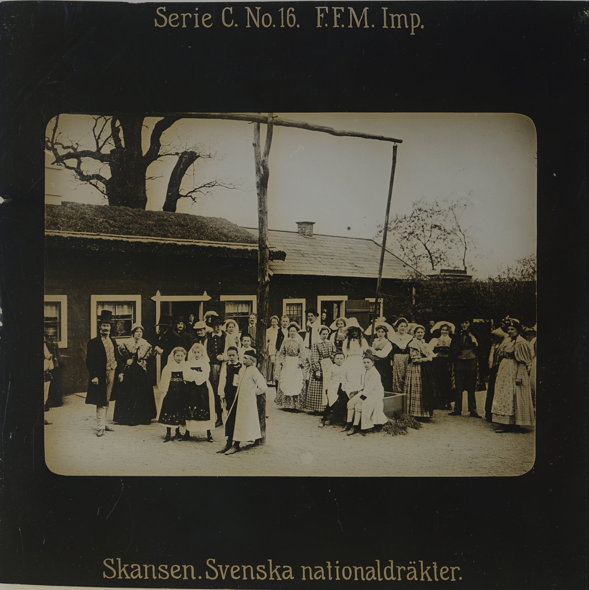 Titel: Personer på Skansen klädda i bland annat olika svenska folkdräkter men även andra modedräkter.