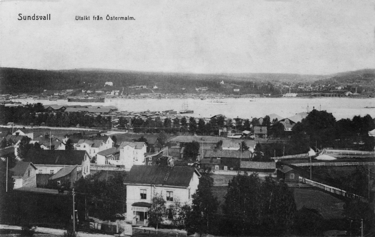 Utsikt från Stadsmon mot norr. Mons sågverk och brädgård samt Rosenborgs magasin nere vid fjärden. Bildtext på vykortet "Sundsvall. Utsikt från Östermalm."
