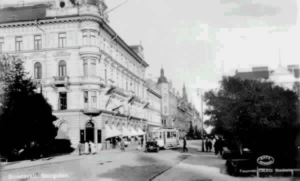 Från vänster kv Olympen 4-3, kv Jupiter till höger kv Proserpina. På Storgatan spårvagn, bil och fotgängare. Text till bild "Sundsvall. Storgatan."