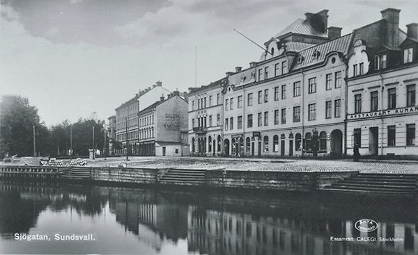 Till vänster Selångersån till höger Sjögatan med bebyggelse. På fastigheten längst till höger syns texten "Restaurant Runan". Bildtext på vykort "Sjögatan, Sundsvall".