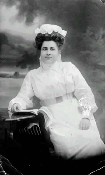 Ateljébild i form av privattaget vykort med frimärke från New South Wales. Text: "May you have a Merry Xmas and a happy New Year is the wish of your loving daughter Phoebe. Xmas 1908. Blyertsant. Morbror Karls fru."
