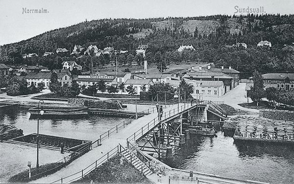 Vy över Norrmalm. Gamla gångbron (kallad Puckelbron och Kamelryggen) över Selångersån. Bron låg i Norrlandsgatans förlängning. Bron raserades 1919 vid den stora vårfloden. Den ersattes med en ny bro, som också kallades Puckelbron, i Malmskillnadsgatans förlängning. Vykort.