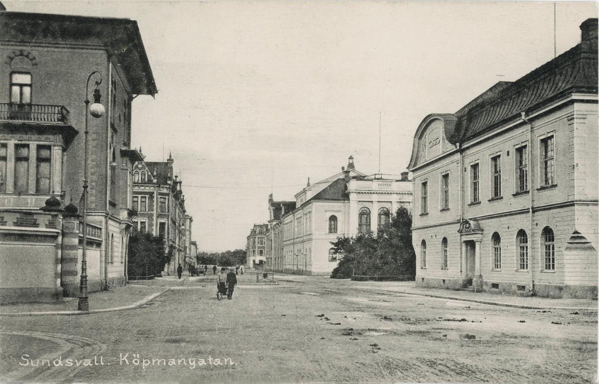 Från vänster kv Tara/ Wikströmska huset och från höger kv Köpmannen/ Odd Fellows ordenshus, efter Esplanadèn kommer kv Kassören/Teatern. Text på vykortet "Sundsvall. Köpmangatan."