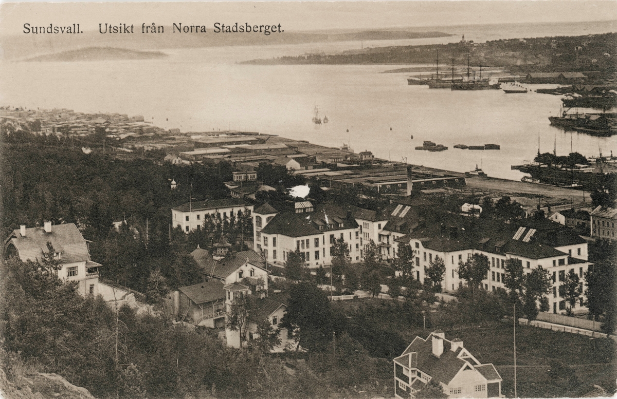 Stadsvy från norr. Från vänster Heffners brädgård, Länssjukhuset samt hamnen. Till höger hamnmagasin och Stadsmon. I bakgrunden Sundsvallsfjärden med ett flertal båtar och segelfartyg. Vykort.