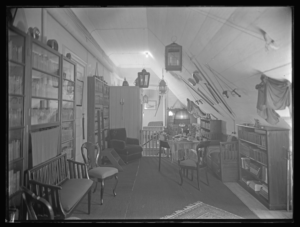 Titel: Bilden visar ett vindsutrymme i Varvschefsbostället i Karlskrona. På taket hänger en några blankvapen.