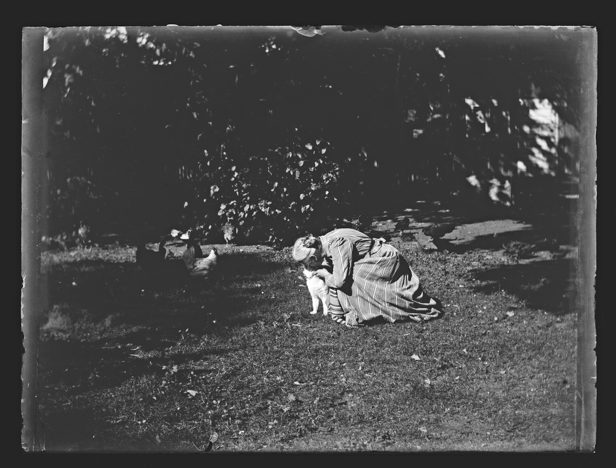 Titel: Bilden visar en kvinna som leker med en katt i trädgården.