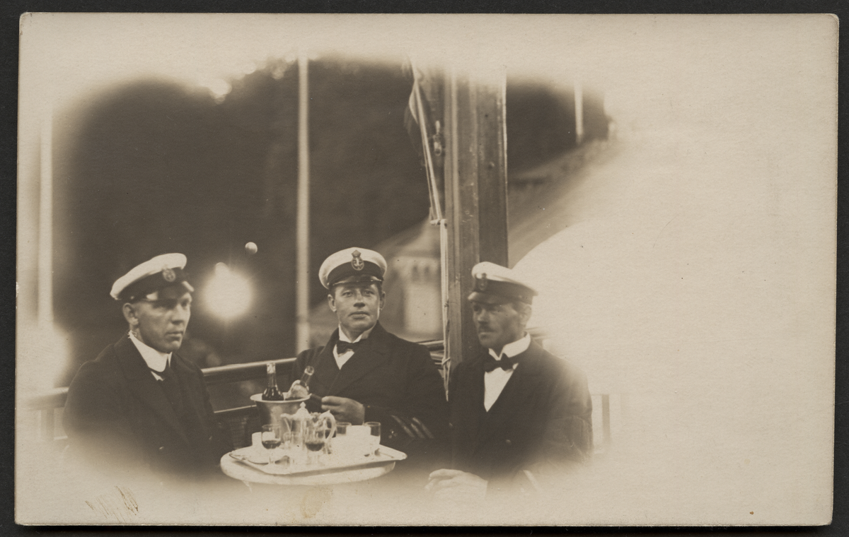 Gruppfotot visar tre sjömän som sitter vid ett bord och dricker vin. Till höger sitter ubåtsmaskinisten Carl-Oscar Jonasson.