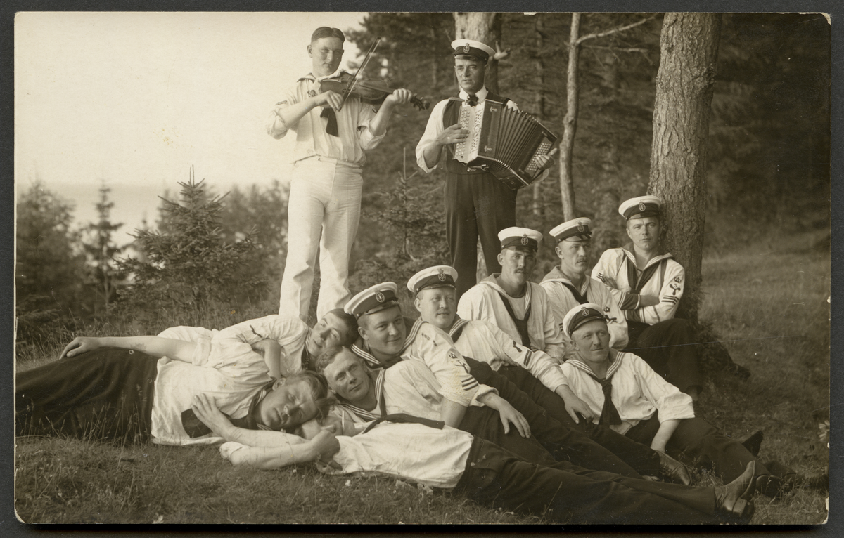 Gruppfotot visar en grupp sjömän som ligger på marken i skogen. Bakom står två musikanter som spelar fiol och dragspel.