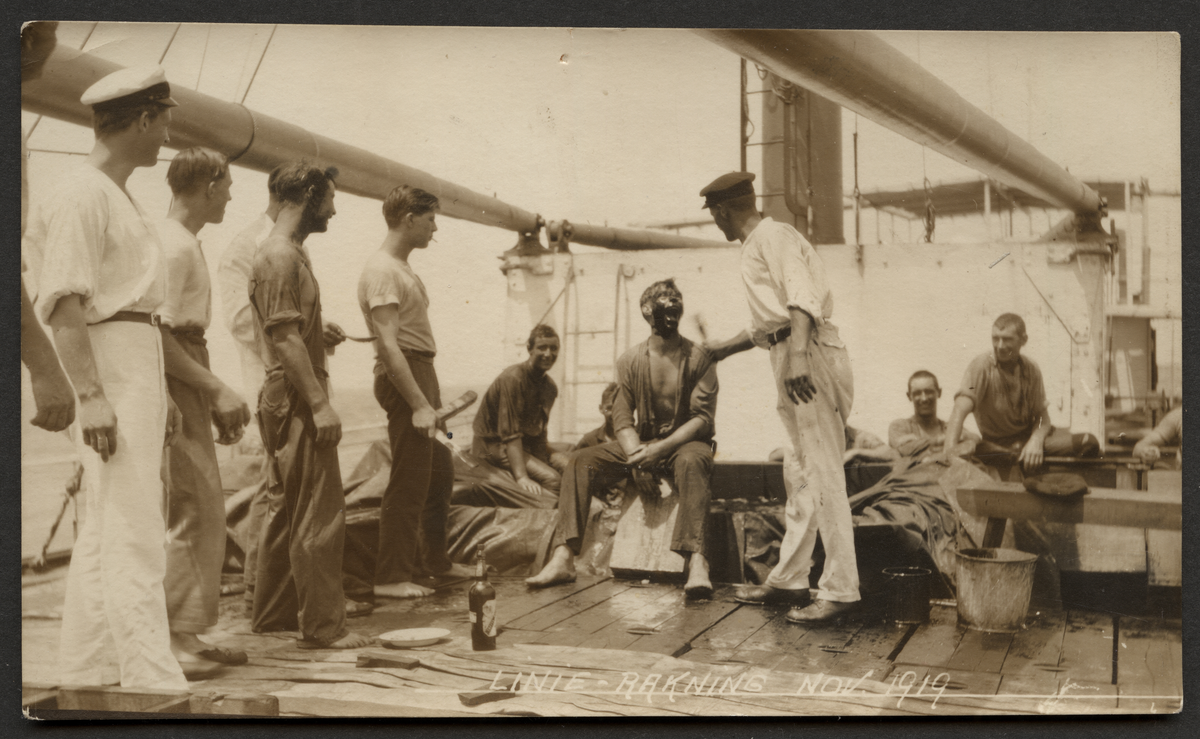Bilden visar linjedopet på ett fartyg. I mitten sitter en sjöman med svart ansikte som blir rakat. Hans kamrater i arbetskläder tittar på. I förgrunden ligger flera utensilier för genomförandet av ritualen.