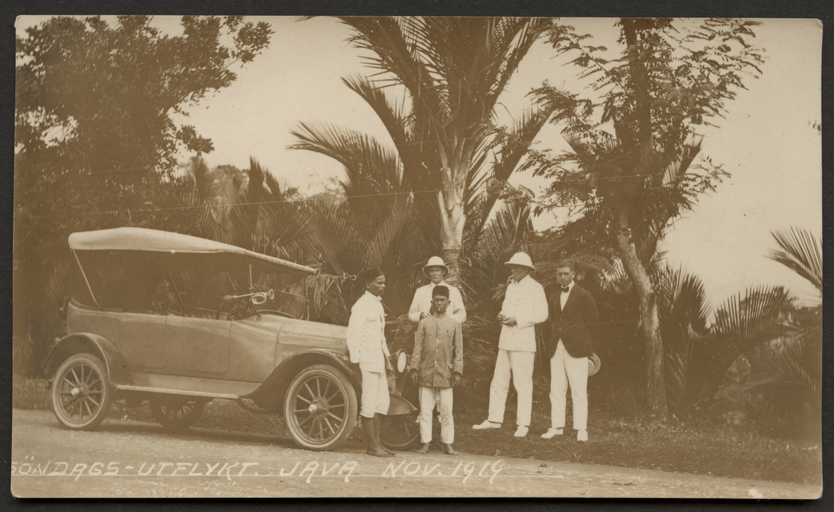 Bilden visar tre män i västerländsk kostym med tropikhjälmar som står bredvid en bil på en landsväg på Java. De har med sig två män ur lokalbefolkningen i traditionella kläder.