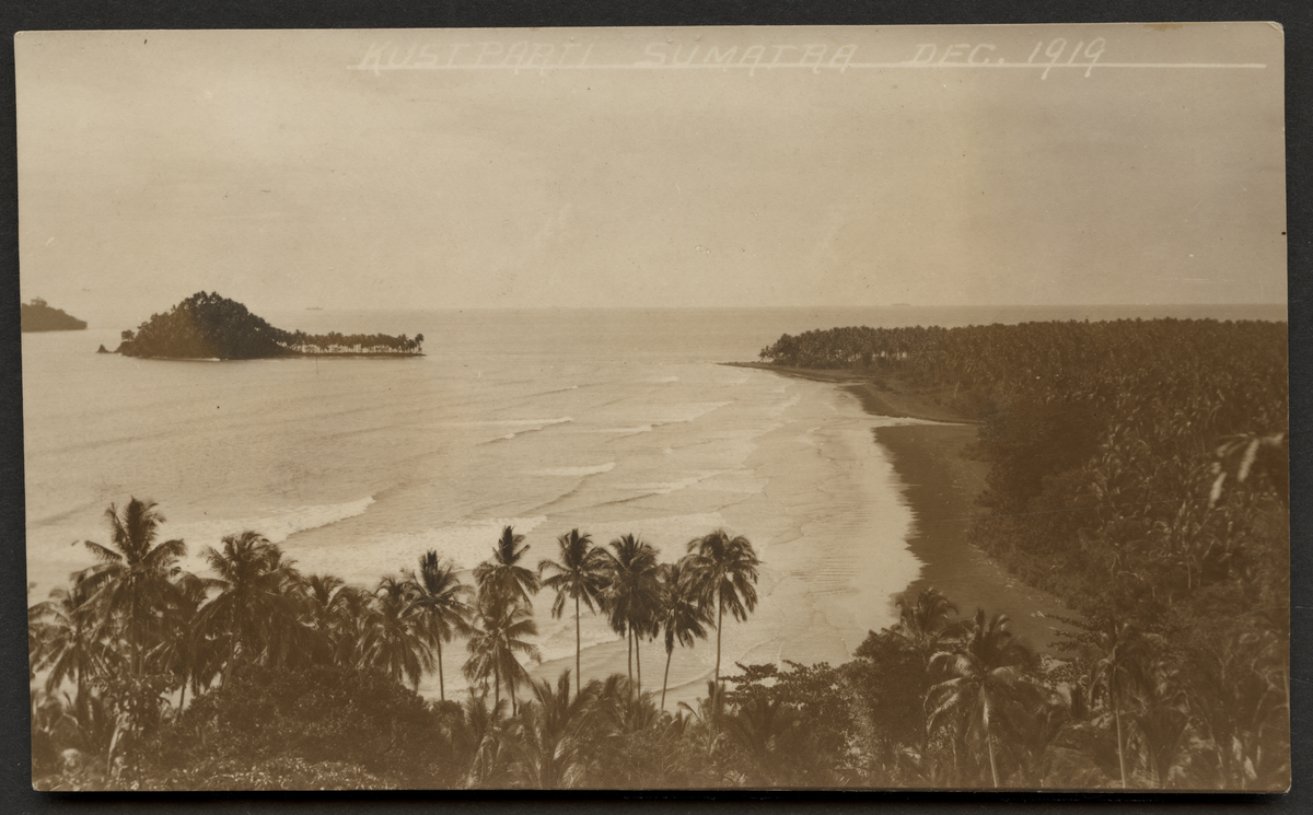 Bilden visar en strand med palmer, havet och en ö i bakgrunden på Sumatra.