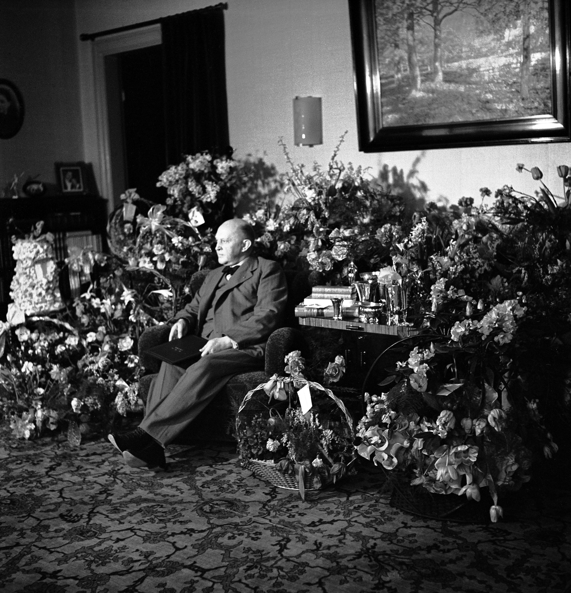 Titel: Köpman Edvard Andersson, innehavare av Bröderna Anderssons pappershandel, sitter i sitt vardagsrum omgiven av mängder med blommor på sin 60-årsdag.