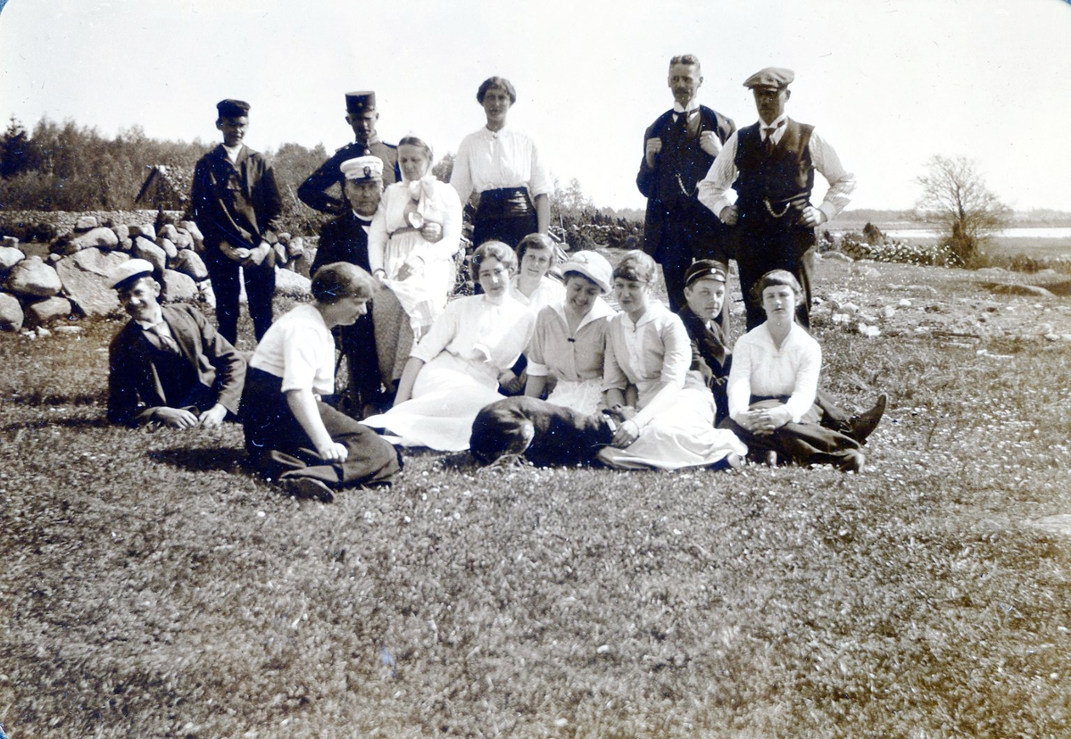 En oidentifierad sergeant, samt en grupp civilklädda personer framför stenmur. Förmodligen samma personer som på föregående bild. Kalmar regemente.