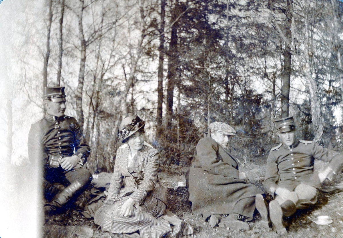 Två oidentifierade subalternofficerare, en civilklädd man och en kvinna sittande i skogen. Kalmar regemente.