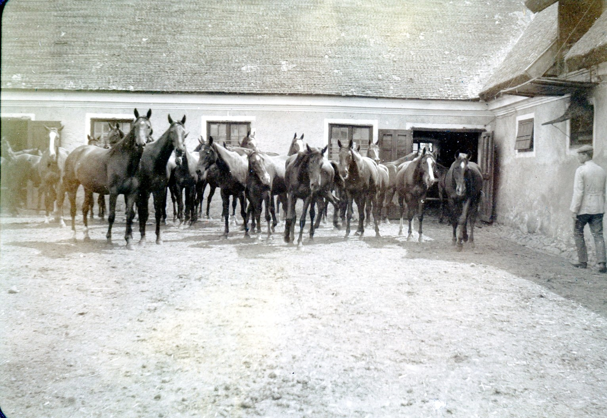 Titel: Hästa framför ett stall. Kalmar regemente.
