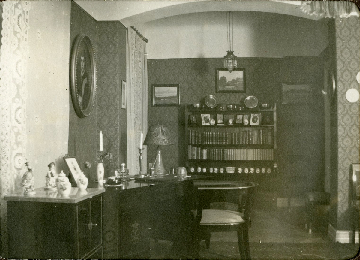 Titel: Matsal med bl a bokhylla och skrivbord. Hultsfred? Kalmar regemente.