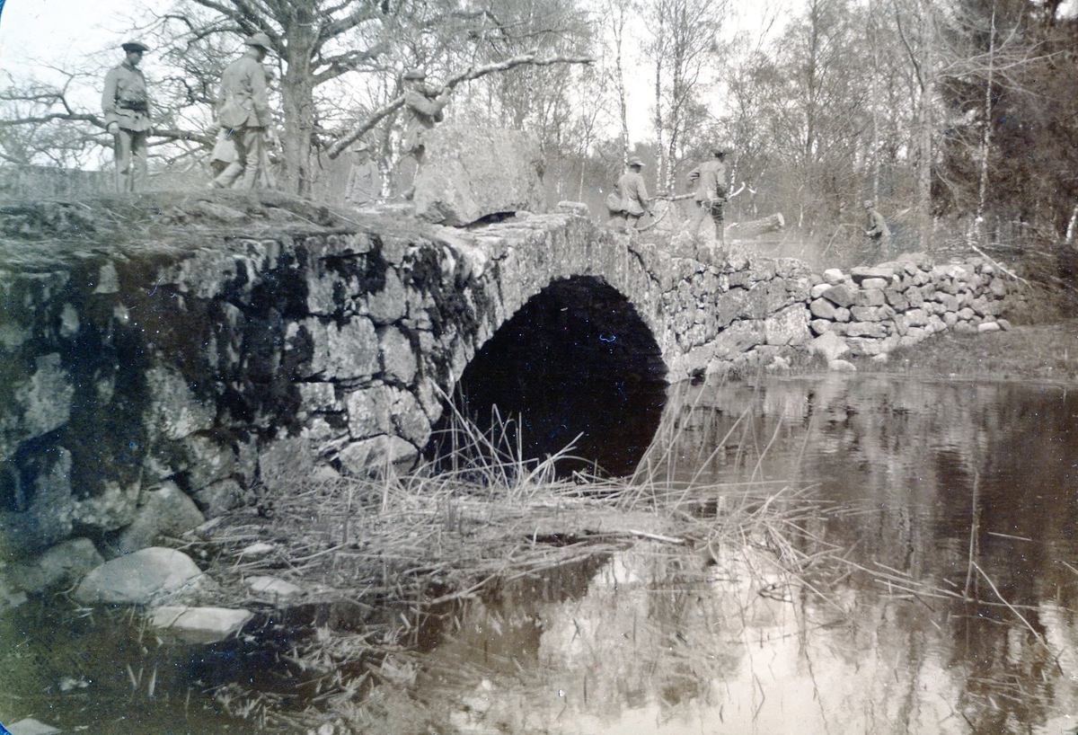 Titel: Soldater i uniform m/1910 rensar en stenbro från nedfallna grenar. Kalmar regemente.