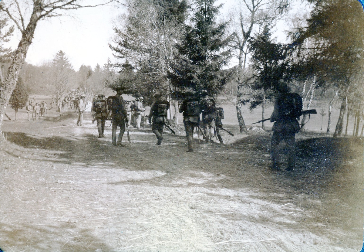 Titel: Trupp i uniform m/1910 som rastar på och vid en grusväg. Kalmar regemente.