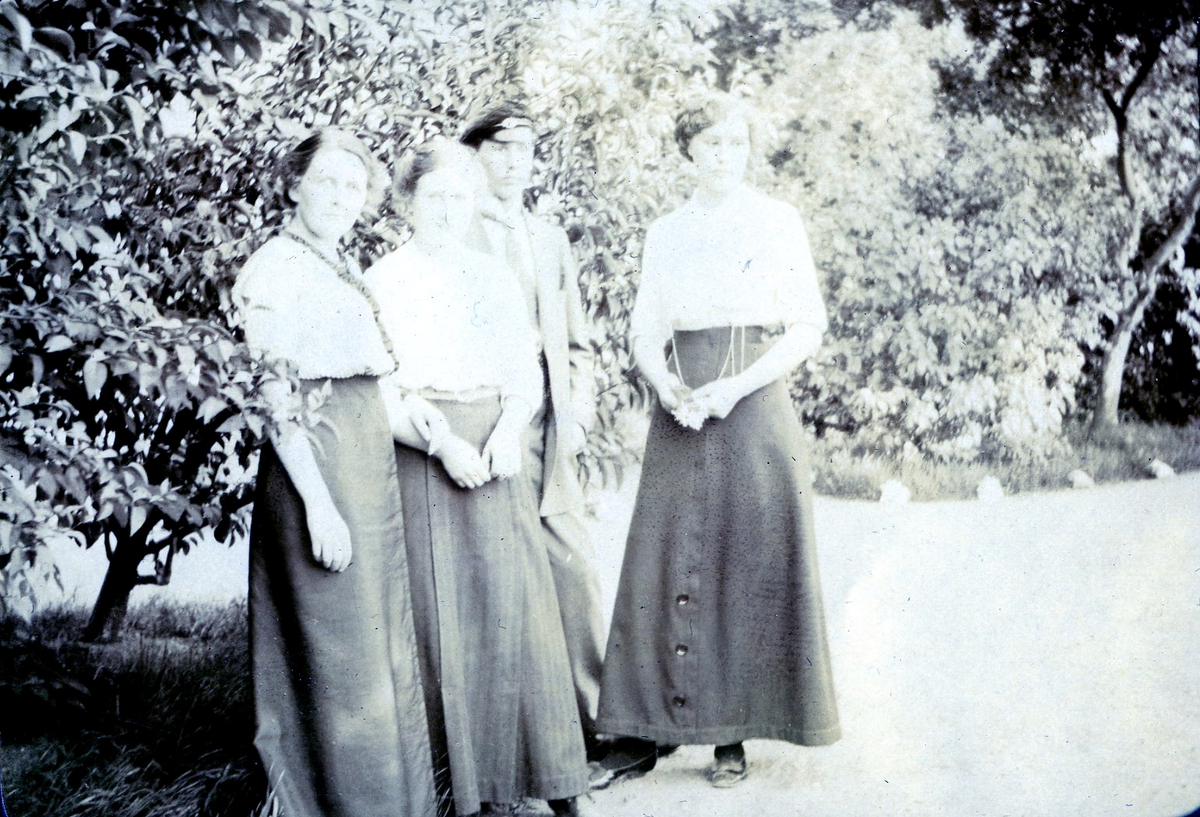 Titel: Oidentifierade kvinnor och en man i trädgård.