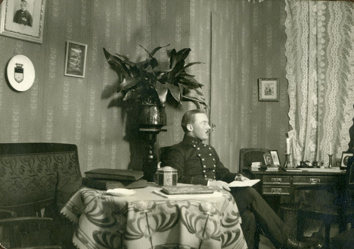 Titel: Oidentifierad löjtnant i syrtut sittande vid bord. Hultsfred? Kalmar regemente.