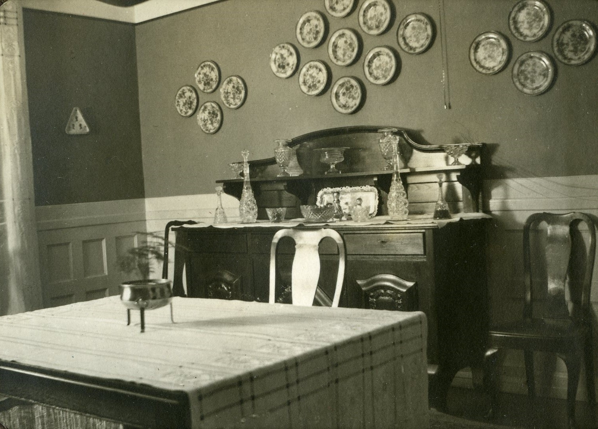 Titel: Matsal med tallrikar på väggen. Hultsfred? Kalmar regemente.
